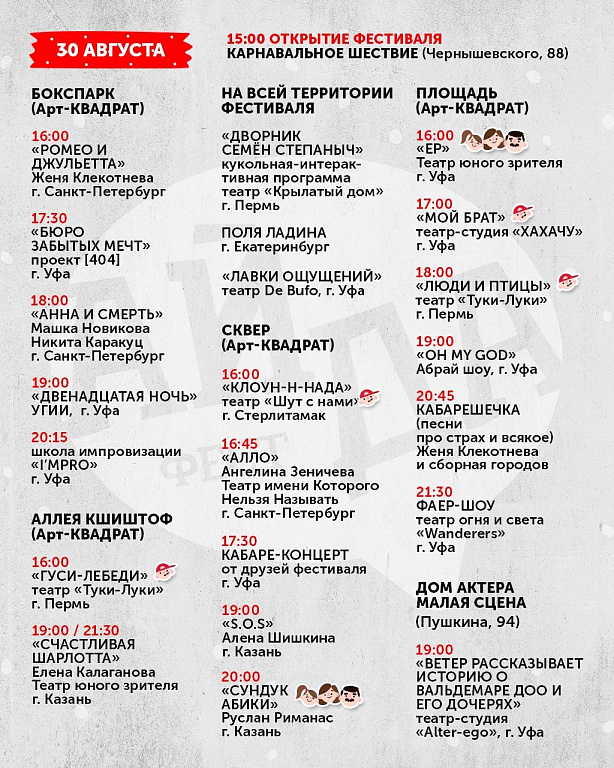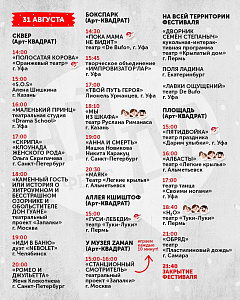 Как сообщает Администрация Уфы, на площадке Арт-КВАДРАТа в течение двух дней зрителей ждут более 30 спектаклей, уличных шоу и перформансов. Свои работы представят театральные коллективы из Москвы, Санкт-Петербурга, Казани, Самары, Екатеринбурга, Альметьевска и других городов страны.