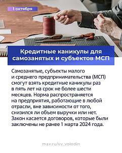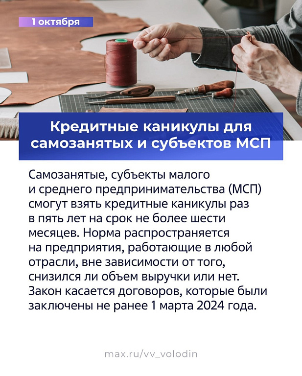 Самозанятые, субъекты малого и среднего предпринимательства (МСП) смогут взять кредитные каникулы раз в пять лет на срок не более шести месяцев. Норма распространяется на предприятия, работающие в любой отрасли, вне зависимости от того, снизился ли объем выручки или нет. Закон касается договоров, которые были заключены не ранее 1 марта 2024 года.
