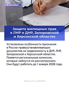 Установлены особенности признания в России правоустанавливающих документов на недвижимость в ДНР, ЛНР, Запорожской и Херсонской областях. Появятся региональные комиссии, которые займутся их рассмотрением. Они будут работать до 1 января 2028 года.