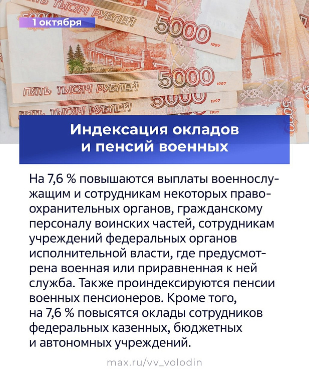 На 7,6 % повышаются выплаты военнослужащим и сотрудникам некоторых правоохранительных органов, гражданскому персоналу воинских частей, сотрудникам учреждений федеральных органов исполнительной власти, где предусмотрена военная или приравненная к ней служба. Также проиндексируются пенсии военных пенсионеров. Кроме того, на 7,6 % повысятся оклады сотрудников федеральных казенных, бюджетных и автономных учреждений.