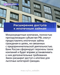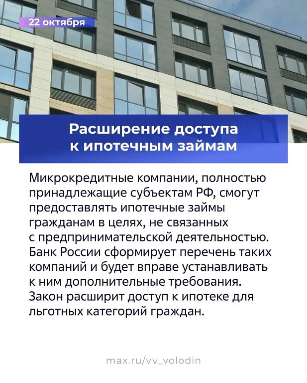 Микрокредитные компании, полностью принадлежащие субъектам РФ, смогут предоставлять ипотечные займы гражданам в целях, не связанных с предпринимательской деятельностью. Банк России сформирует перечень таких компаний и будет вправе устанавливать к ним дополнительные требования. Закон расширит доступ к ипотеке для льготных категорий граждан.