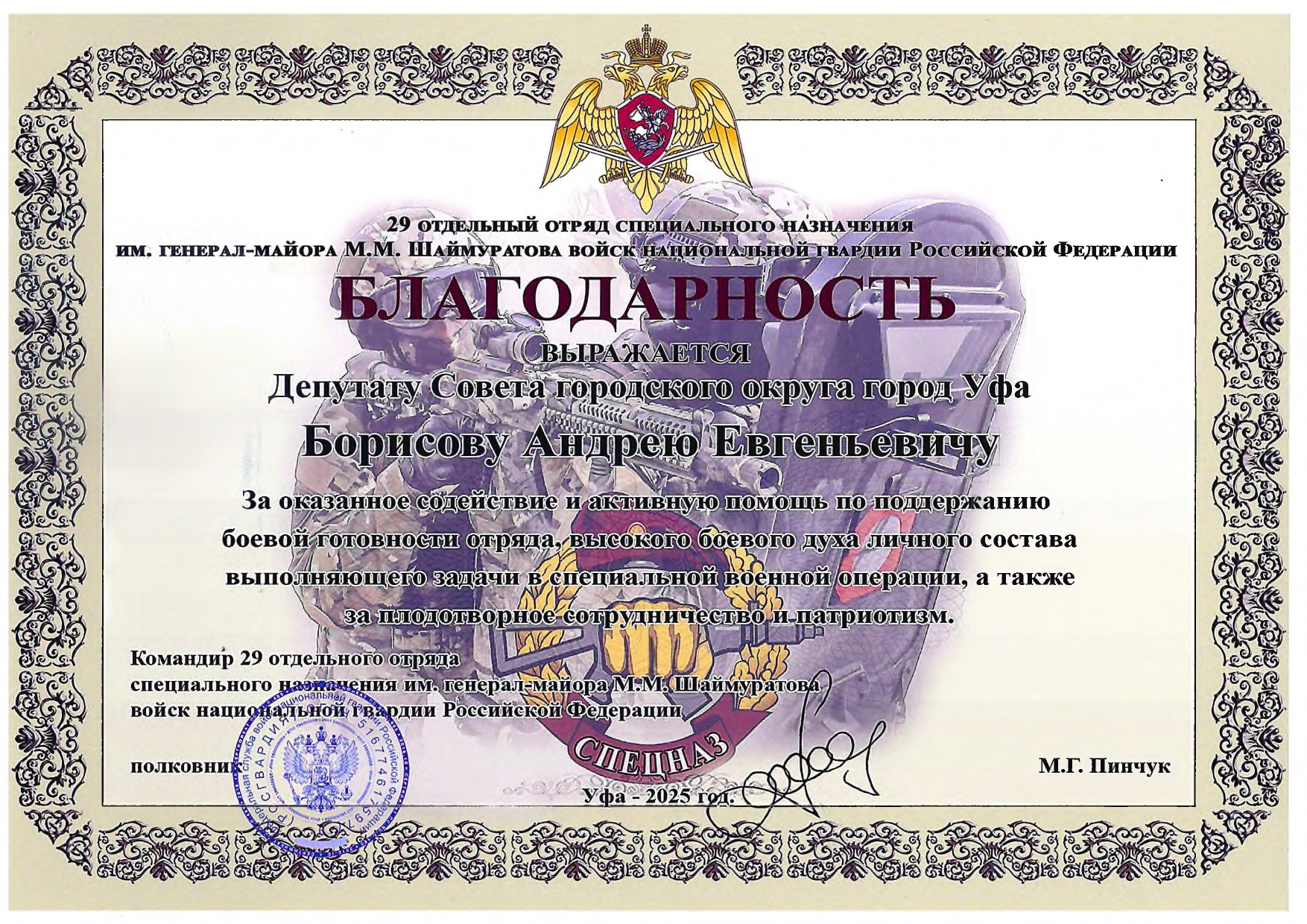 Благодарность от 29 отдельного отряда специального назначения им. М.М. Шаймуратова войск национальной гвардии России