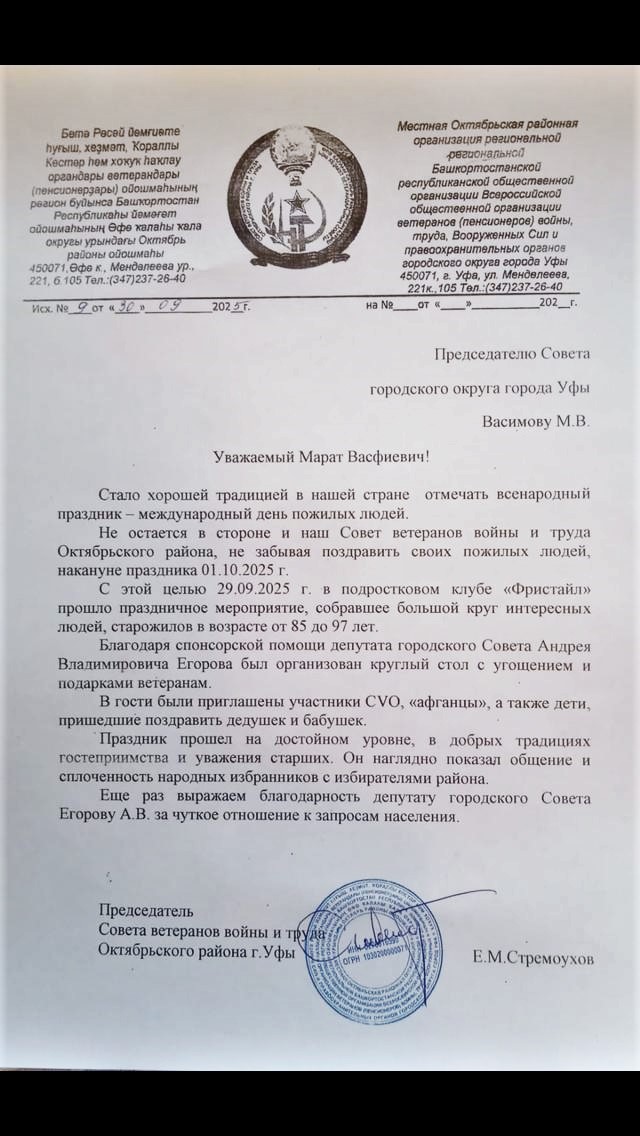 Благодарность от Совета ветеранов войны, труда и правоохранительных органов Октябрьского района Уфы