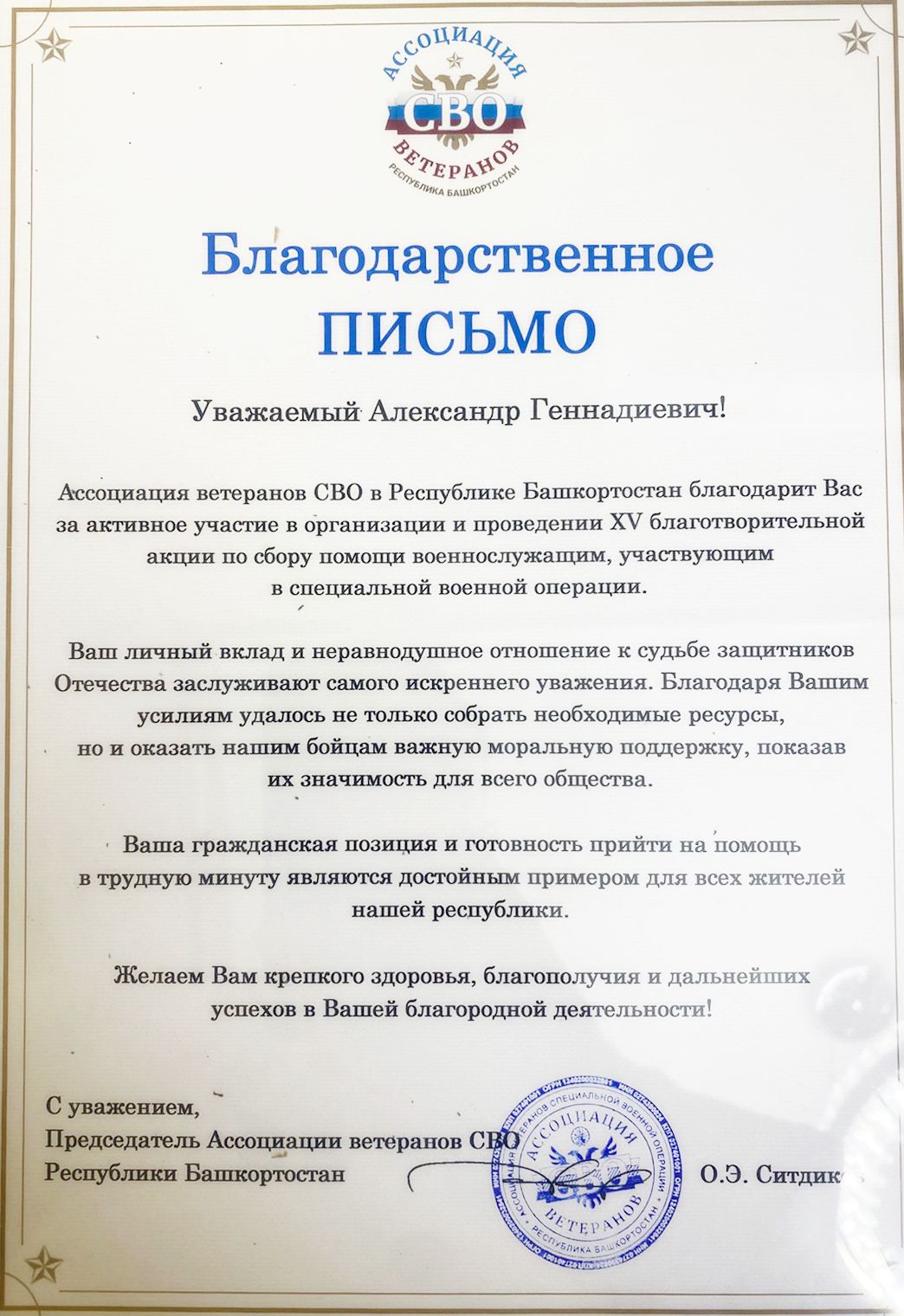 - Благодарность Председателя Государственного Собрания – Курултая Республики Башкортостан К.Б. Толкачева, 2020, 2023