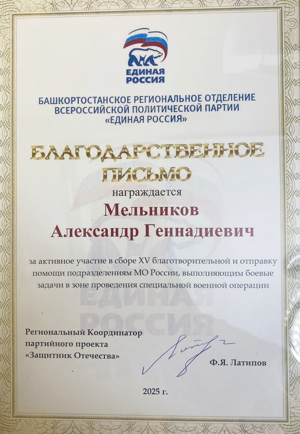 - Благодарственное письмо Секретаря Башкортостанского регионального отделения Партии «Единая Россия» Р.Ф. Хабирова, 2020
