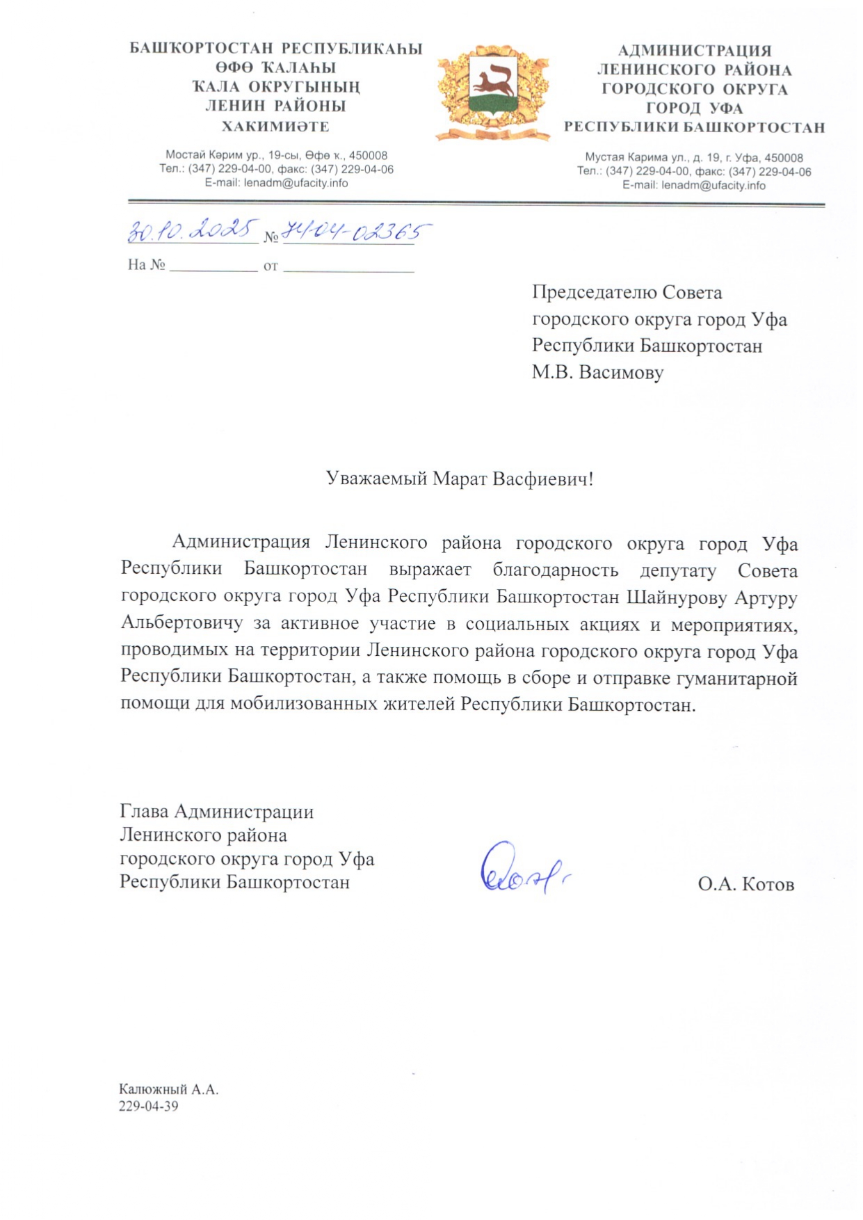 Благодарность от Администрации Ленинского района ГО г. Уфа РБ
