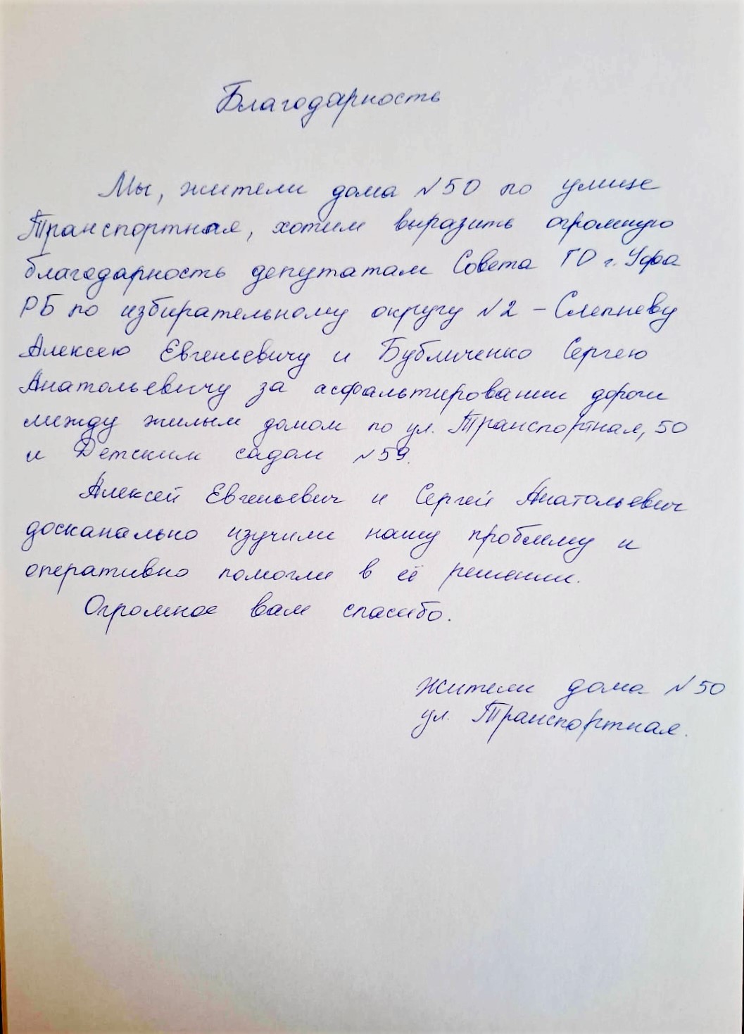 Благодарность от жителей дома №49/1 по улице Тухвата Янаби г. Уфы