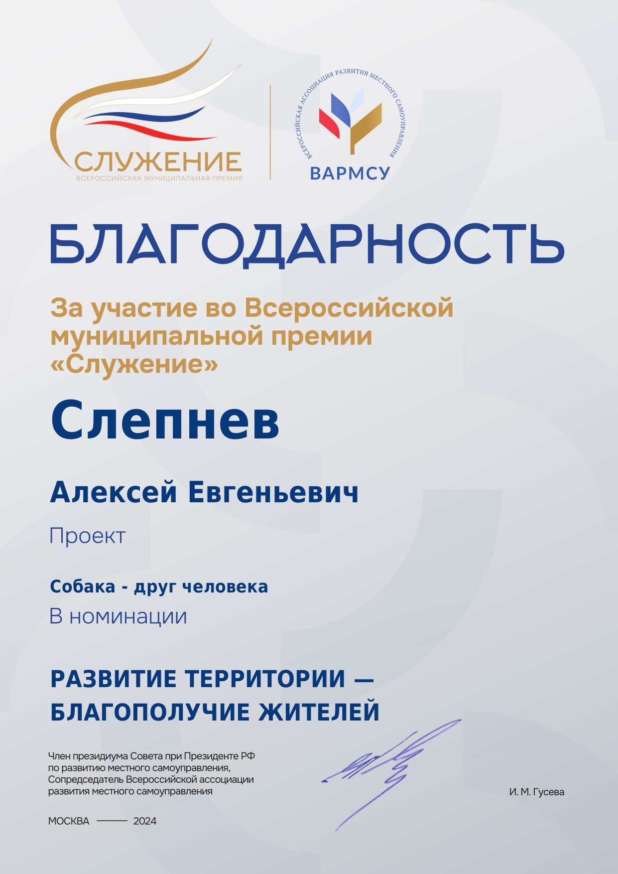 Благодарность от Сопредседателя Всероссийской ассоциации развития местного самоуправления И.М. Гусевой