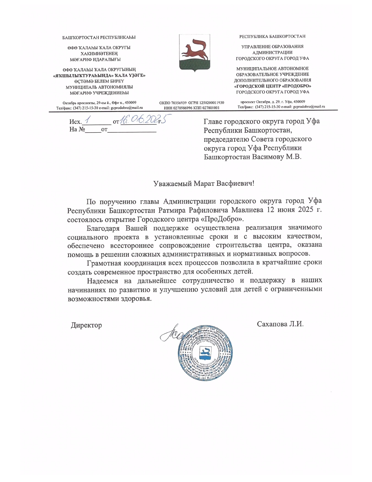 - Благодарности Министерства семьи, труда и социальной защиты населения Республики Башкортостан, Министерства культуры Республики Башкортостан, Администрации городского округа город Уфа Республики Башкортостан, Администрации Советского района городского округа город Уфа Республики Башкортостан, Администрации Орджоникидзевского района городского округа город Уфа Республики Башкортостан, Администрации Демского района городского округа город Уфа Республики Башкортостан