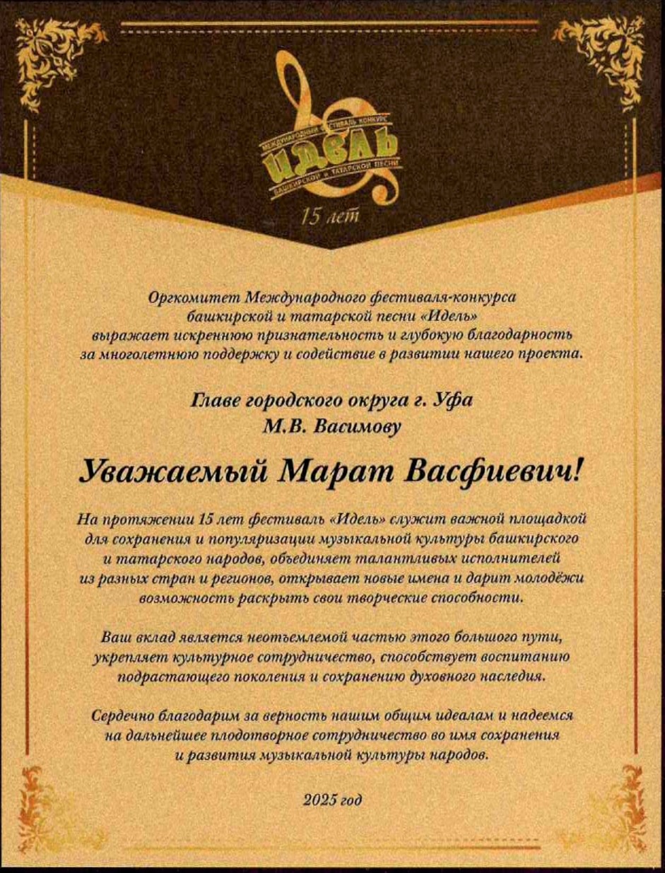Благодарность от Оргкомитета международного фестиваля-конкурса башкирской и татарской песни "Идель"