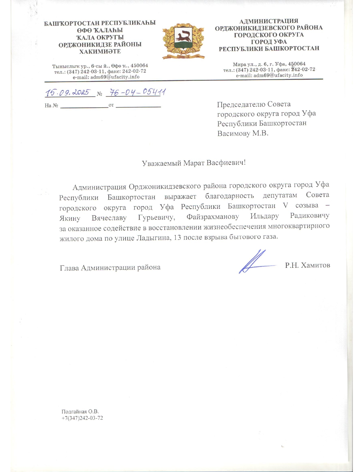 Благодарность от Администрации Орджоникидзевского района Уфы