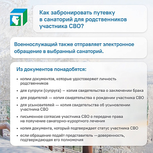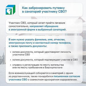Чтобы забронировать путевку, участнику СВО необходимо направить электронное обращение в выбранный санаторий, указав личные данные, контактную информацию и приложив документы, подтверждающие участие в СВО и регистрацию в Башкортостане.