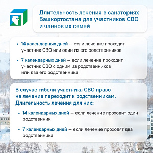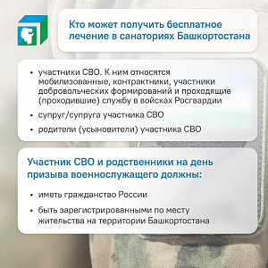 В Башкортостане продолжается системная работа по поддержке участников специальной военной операции и членов их семей. Одним из направлений этой помощи является предоставление бесплатного санаторно-курортного лечения.