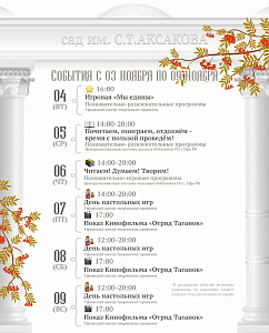 14:00-20:00 – познавательные программы «Почитаем, поиграем, отдохнем – время с пользой проведем!» в Саду Аксакова;