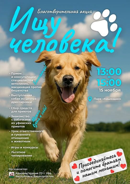 15 ноября в Уфе вновь состоится благотворительно-просветительская акция «Ищу человека». Это мероприятие направлено на помощь бездомным животным и формирование бережного отношения к ним.