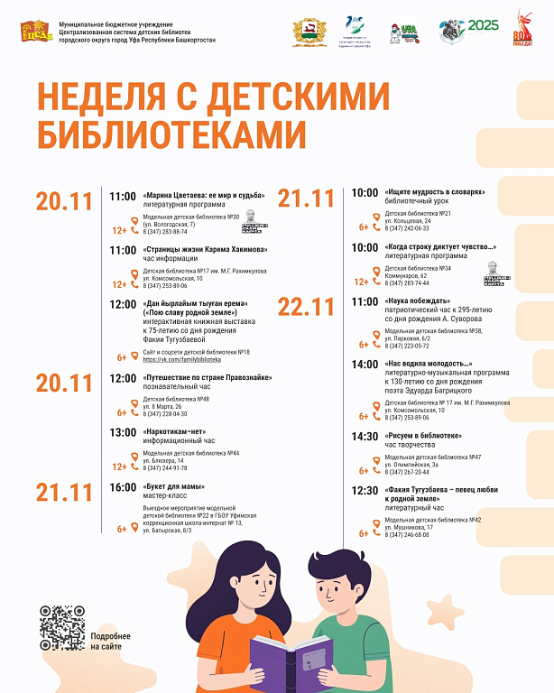 Актуальное расписание и адреса библиотек размещены в информационных карточках. Возможны изменения в программе. Для групповых посещений предусмотрена предварительная запись.