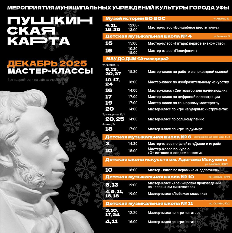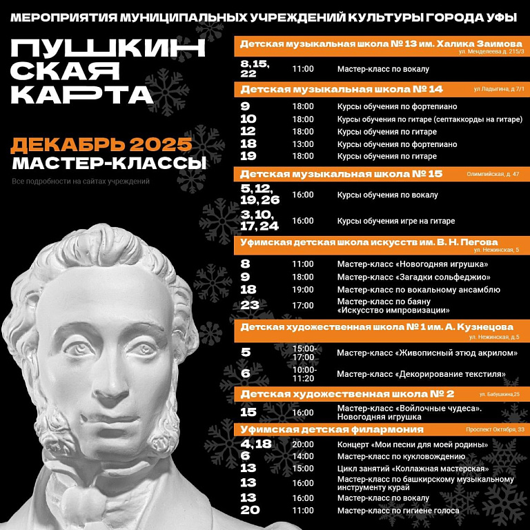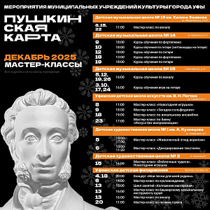 В Уфе стартовала серия декабрьских мероприятий, которые юные жители города могут посетить бесплатно по «Пушкинской карте». Зима – хорошее время, чтобы провести досуг в атмосфере искусства, а городские учреждения культуры подготовили для этого разнообразную программу.