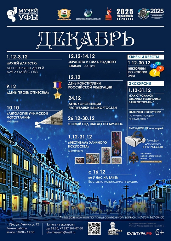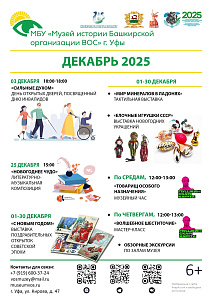 Декабрьские дни можно провести познавательно и интересно в музеях города Уфы. Учреждения культуры подготовили для посетителей насыщенную программу – экскурсии по историческим и художественным экспозициям, тематические лекции, встречи с экспертами, мастер-классы для взрослых и детей.